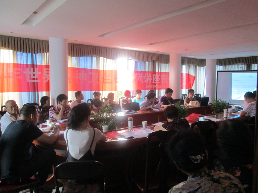 ????? 為迎接第22個世界精神衛(wèi)生日, 10月9日下午2點,我院防治科聯(lián)合甌海區(qū)南白象街道開展《精神衛(wèi)生法與精神障礙的社區(qū)識別》講座, 社區(qū)民警、殘聯(lián)、民政干部、各村委代表、責(zé)任醫(yī)師、精神疾病患者家屬參加了此次活動。精衛(wèi)辦倪飛蕊醫(yī)師從普及精神衛(wèi)生法意義開場,引導(dǎo)群眾關(guān)注心理健康,預(yù)防精神障礙的發(fā)生,同時指導(dǎo)社區(qū)精神障礙患者家庭康復(fù),提倡共同維護好精神障礙患者的人格尊嚴和合法權(quán)益。?