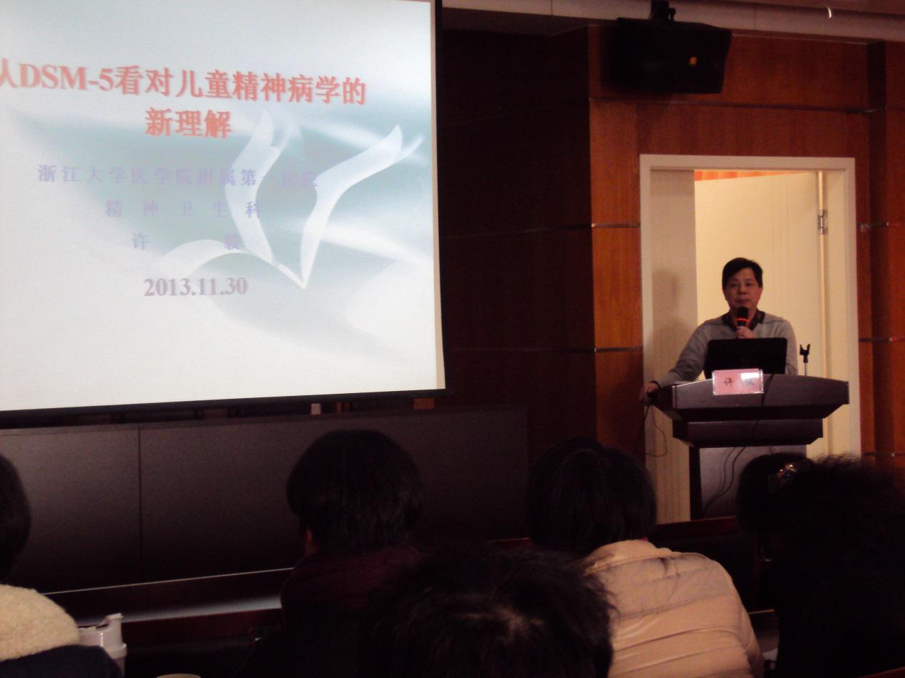 ???????? 11月30日上午,由我院主辦的市級繼教項目《兒童青少年心理障礙的家庭治療》學習班在康復樓六樓會議室舉行,來自溫州地區(qū)各個縣市的社區(qū)衛(wèi)生服務中心、學校、心理咨詢室、綜合醫(yī)院的學員共計90余人參加了此次學習班。浙江大學醫(yī)學院附屬第一醫(yī)院許毅教授為大家講授從DSM-ⅴ看待兒童精神精神障礙,我院鄭維芳副院長從沖突的覺知和抱持角度介紹了系統(tǒng)治療的核心。會上專家們深入淺出的講解和詼諧的語調(diào)一定程度上提高了精神衛(wèi)生專業(yè)人員、教育工作者、心理咨詢師對兒童青少年行為障礙的識別與干預工作,提高了從業(yè)人員對家庭治療在兒童青少年行為障礙領(lǐng)域的應用能力。本次學習班同時建立了教育工作者、心理咨詢師和精神衛(wèi)生專業(yè)人員的溝通、交流和合作平臺,促進對兒童青少年行為障礙的早期識別、轉(zhuǎn)介及干預的順利實施。