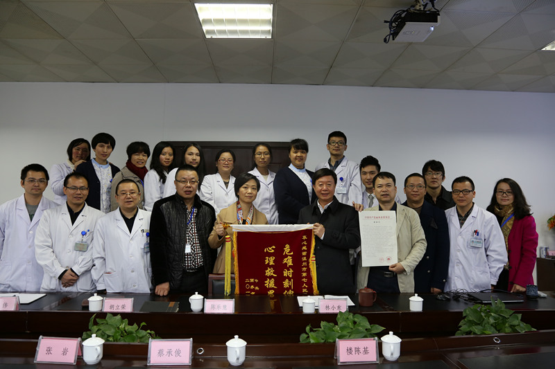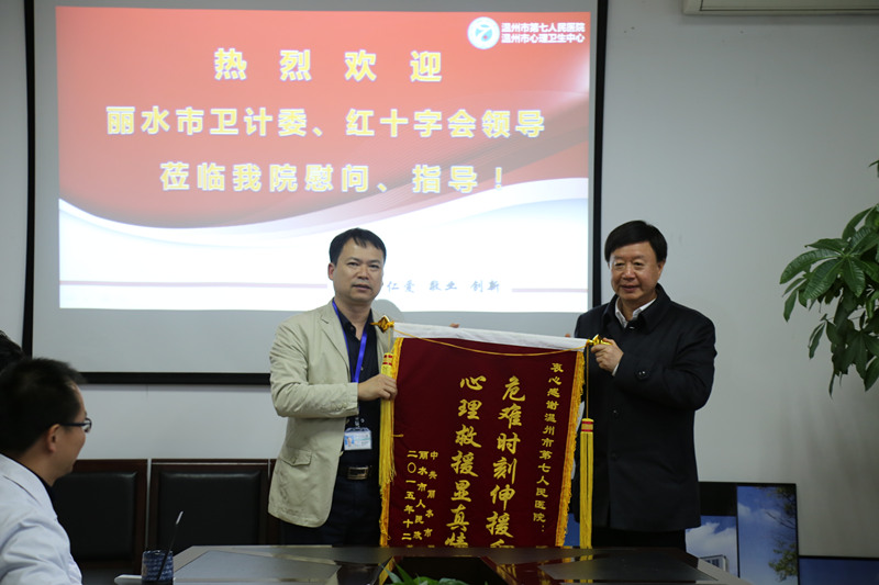 12月9日,麗水市衛(wèi)計(jì)委副主任蔡承俊、辦公室副主任樓陳基,紅十字會(huì)心理救援隊(duì)副隊(duì)長張巖受麗水市市委市政府委托,在溫州市衛(wèi)計(jì)委副主任陳樂慧的陪同下,到市七醫(yī)親切慰問參與里東災(zāi)情心理救援工作的心理援助隊(duì)隊(duì)員,并送上錦旗和感謝信。市七醫(yī)院長林小東,書記胡立榮、副院長張偉及相關(guān)科室負(fù)責(zé)人陪同慰問。