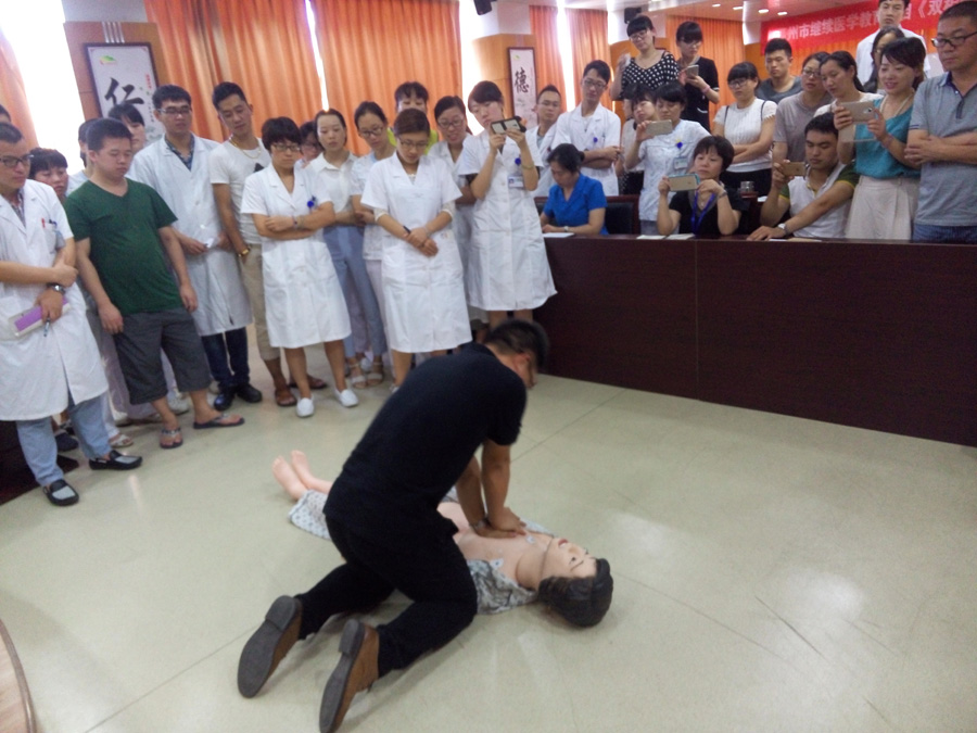 易站長(zhǎng)還讓大家就臨床上碰到的問(wèn)題提出來(lái)一起探討,大家踴躍提出了各自臨床上碰到的問(wèn)題,易站長(zhǎng)一一做了解答。最后,為了讓大家能更好掌握這些急救重要的技能,易站長(zhǎng)親自做了模型演練,邊講解邊做。為了大家對(duì)按壓節(jié)律有更深體會(huì),他風(fēng)趣地說(shuō):“這個(gè)按壓的速度和時(shí)下流行的歌曲《小蘋(píng)果》的節(jié)奏一樣?!爆F(xiàn)場(chǎng)的醫(yī)護(hù)人員就用手機(jī)播放《小蘋(píng)果》,易站長(zhǎng)跟著節(jié)奏按壓,每分鐘至少100次以上,大家對(duì)按壓節(jié)律更能了然于胸。