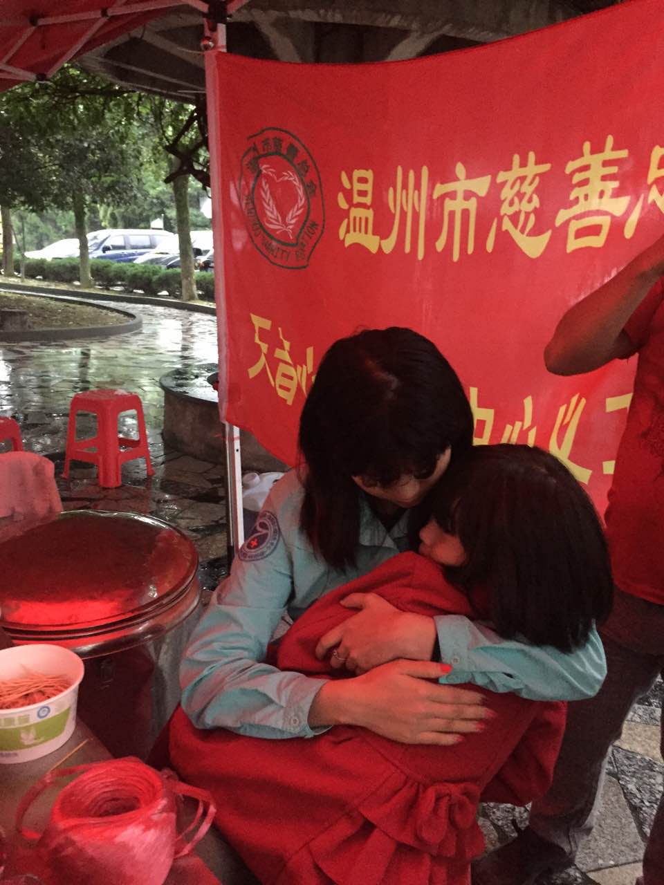 應夢珍注意到她,走過去擁住她,輕輕和她說話。小女孩緊緊地回抱住應夢珍。應夢珍就勢坐到凳子上,緊緊把她抱在懷里。小女孩雖然穿著大衣,但小手冰涼涼的,小小的身體一直在顫抖。應夢珍低頭努力把她環(huán)抱得更緊,用自己的體溫給她帶去一些溫暖。經(jīng)過了解,得知小女孩是剛剛跟隨奶奶、阿姨從福建趕來溫州的,她的媽媽在這次民房垮塌中不幸去世了。