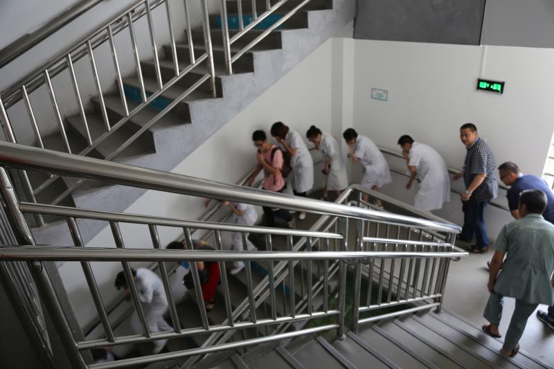 培訓結束后,啟動實地消防演習??祻?樓消防警報響起,保衛(wèi)科疏散組人員和護士長一起組織醫(yī)護人員和職工按指定安全線路撤離,安全員站在樓梯口維持秩序。全體人員在短短兩分鐘內就撤出住院樓,到達東門院外空曠場地,整個疏散過程緊張、有序,所有醫(yī)護人員和職工都按計劃方案行動。