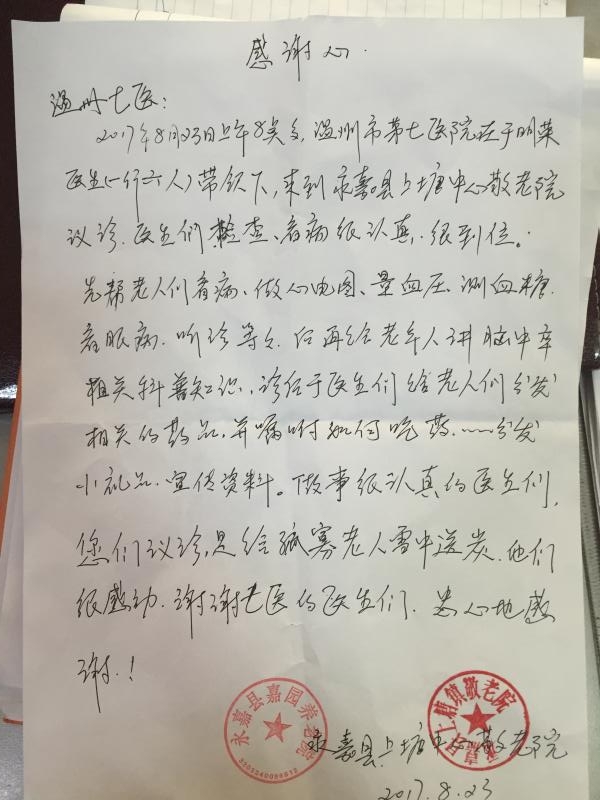 8月23日,我院“蒲公英之旅第三站走進(jìn)永嘉縣上塘中心養(yǎng)老院。對(duì)于“七醫(yī)人”來(lái)說(shuō),這只是一次普通又平常的義診活動(dòng),卻意外收到一份特殊的“禮物”。