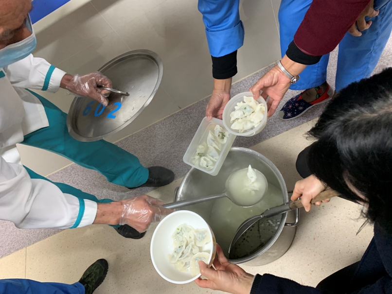 ? ? ?當老師伯拉著飯車進病室時,大家蜂擁而至,帶著“工具”等待著美餐。瞧他們吃得多開心啊,一個個都在光盤行動。他們是那么的容易滿足,幾個餃子就幸福滿滿,老人家都紛紛表示這樣的活動應該多多益善,又可以操起“包餃子”老本行,還可以相互探討、學習五花八門的餃子的包法,最嘚瑟的是自己包的餃子就是特別好吃?;颊呒覍僖簿硎咀≡谶@樣的病房里心很溫暖。?