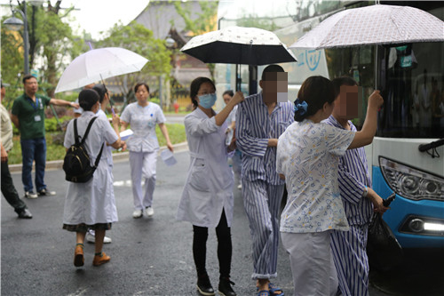 時隔一日,潘橋新院又迎來一批新“客人”。5月23日上午,細雨伴隨著涼意,兩輛救護車,以及兩輛大巴車從西山院區(qū)按時出發(fā)并在既定時間到達潘橋院區(qū)住院部樓下。9點20時許,院領導、職能科室,以及病區(qū)醫(yī)護人員,以及全院所有行政科室,均在住院大樓一樓等候,運載著二病區(qū)70多名患者大巴剛到,保衛(wèi)人員、醫(yī)護人員就早已等候就緒。住院樓門口的所有通道處,都駐守著特勤人員、安保人員,以及醫(yī)護和行政人員,以確保安全進行。