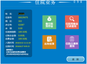 ??? 病區(qū)床邊結(jié)算和自助出院結(jié)算功能上線后,患者在護(hù)士站或自助終端就可辦理出院,大大減少排隊(duì)等待時(shí)間,避免來(lái)回奔波的麻煩。目前,醫(yī)院為患者辦理出院提供多種結(jié)算方式,包括預(yù)繳款結(jié)算、POS機(jī)刷卡結(jié)算、預(yù)繳款與POS機(jī)結(jié)合結(jié)算等,更提供預(yù)繳款余額秒退服務(wù),實(shí)現(xiàn)住院無(wú)現(xiàn)金化。此外,自助終端還提供住院發(fā)票和住院清單自助打印服務(wù)。