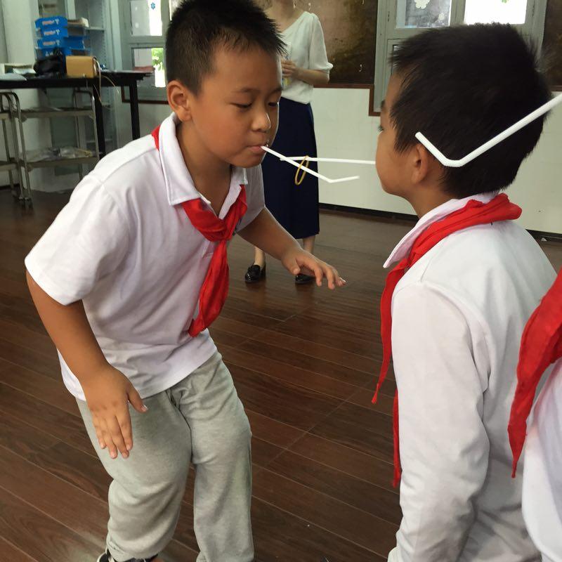 ?? “啄木鳥行動”是每個人把吸管銜在嘴巴里,雙手放在背后,扮成“啄木鳥”,口銜吸管傳遞“蟲子”,按順序依次傳遞,只能在吸管間傳遞,不能用手,先傳到最后一位同學(xué)的組獲勝,分組進(jìn)行兩次PK。在游戲中,我們能明顯的發(fā)現(xiàn),第一次PK中小朋友為快速完成任務(wù),會手忙腳亂甚至?xí)嗷ブ肛?zé),難以達(dá)到他們預(yù)期的目標(biāo)。經(jīng)過一輪比拼后,咨詢師指導(dǎo)他們要在游戲中保持平常心,不可以指責(zé)自己的伙伴,一定要耐心的相互幫助相互鼓勵,經(jīng)過指導(dǎo)后,小朋友們在第二次游戲中顯得耐心、安靜很多,最后完成任務(wù)的時間比第一次也大大的縮短。一個簡單的小游戲就能讓他們?nèi)ニ伎紙F(tuán)隊合作的意義。