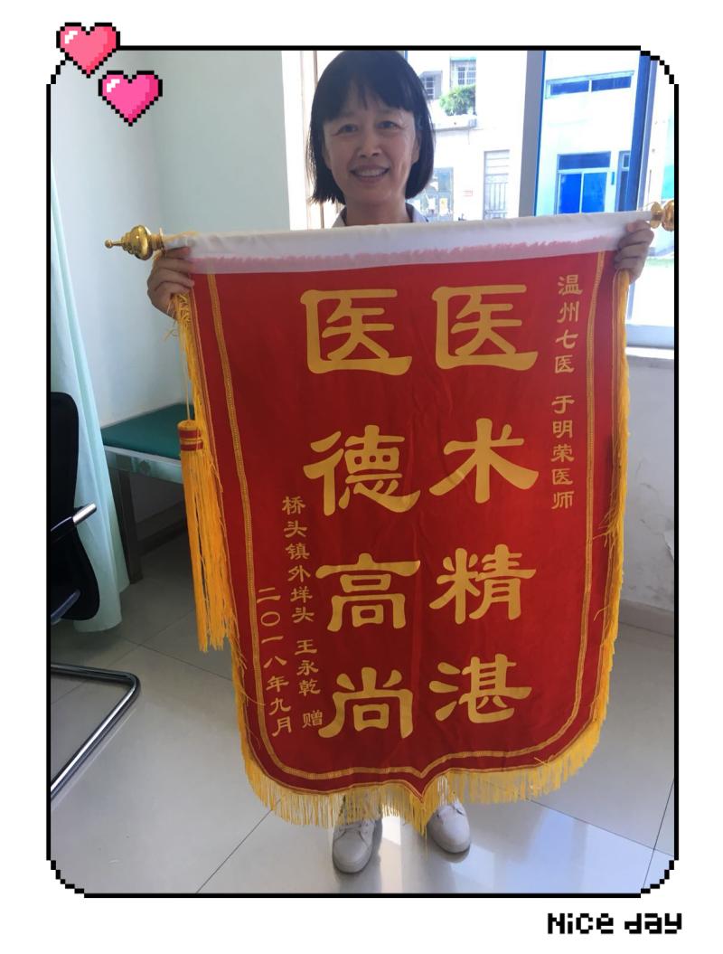 9月20日上午,西山門診大廳迎來了一對開心的父子,他們一見到于明榮主任,就興沖沖的拿著一面寫有“醫(yī)德高尚,醫(yī)術(shù)精湛”的錦旗,雙手捧著紅紅的錦旗送到了于主任手里。一直說“非常感謝!非常感謝!”一直緊緊握住于主任的手不放。