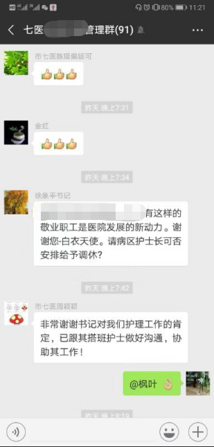 “有這樣敬業(yè)的職工是醫(yī)院發(fā)展的新動(dòng)力。謝謝你——白衣天使?!眻D片在群里流傳后,市七醫(yī)黨委書(shū)記徐象平也在群里第一時(shí)間點(diǎn)贊,還囑咐病區(qū)護(hù)士長(zhǎng)盡量給予安排調(diào)休,讓帶病堅(jiān)守崗位的謝陸秀能夠盡快康復(fù)身體。