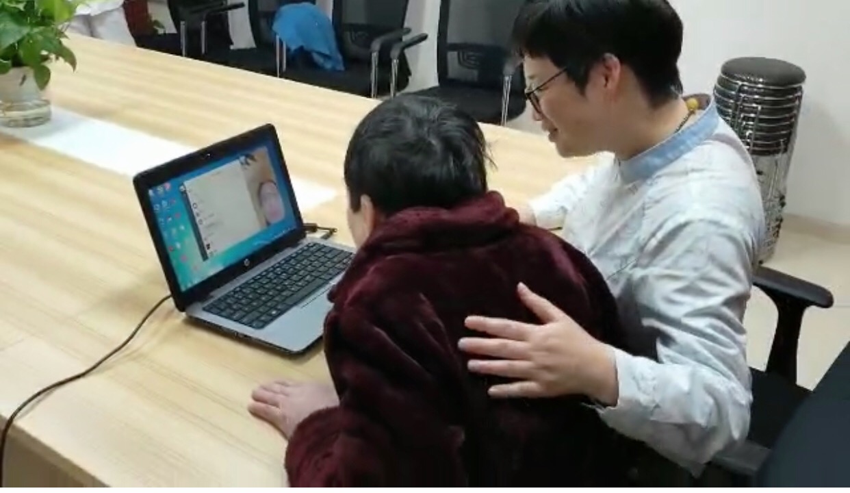 ?? ? ?早幾日,陳建敏護(hù)士長(zhǎng)在病房不斷穿梭,關(guān)切留院患者的心理所求,在知道小蘭內(nèi)心對(duì)家人的思念后,今天就給她送上豬年的第一份“專(zhuān)屬禮物”:在溫州市第七人民醫(yī)院八樓住院樓示教室內(nèi),小蘭正與她家人暖情視頻通話,雖然因?yàn)橹橇Φ拖碌年P(guān)系,小蘭不會(huì)表達(dá)一些深刻的情感,可是,對(duì)家人的愛(ài),幾乎就是不需要訓(xùn)練的,面對(duì)著顯示屏中的親人,她也會(huì)動(dòng)情地說(shuō):“小麗(患者妹妹、化名),真的很想你們了,你看這樣你們多好,你們不用跨洋來(lái)看我了。你放心,我在這個(gè)家里很好”,妹妹在海洋那一頭熱淚盈眶、哽咽不能語(yǔ),也是在這樣一次安排中,老年科的醫(yī)護(hù)人員一不小心也促成了小蘭人生中的第一次,她生平第一次見(jiàn)到了她素昧謀面、現(xiàn)在已經(jīng)是美國(guó)的一個(gè)檢察官的弟弟,畫(huà)面定格在“你說(shuō)你笑,你動(dòng)我懂”的溫馨鏡頭,而這個(gè)一幕真情的自然流露,難道不是最真摯的禮物嗎?