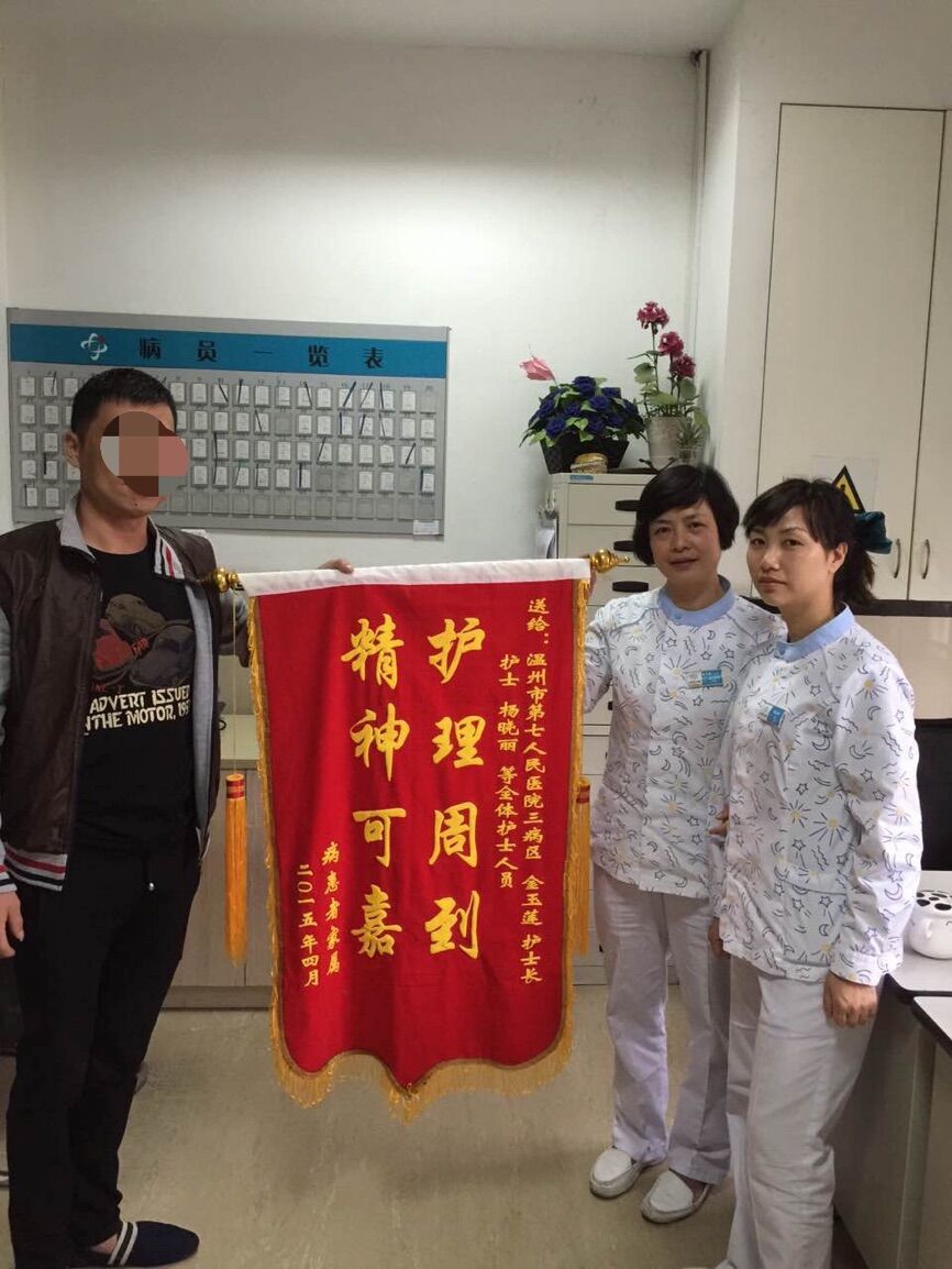 428下午,我院護(hù)理部收到了一面繡著“護(hù)理周到,精神可嘉”八個金字的錦旗,它是一位周姓住院患者的家屬為了感謝三病區(qū)護(hù)士長金玉蓮和護(hù)士楊曉麗等全體護(hù)理人員而特意制作贈送的。