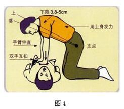 ? ? 胸外心臟按壓方法(如圖4):急救者兩臂位于病人胸骨的正上方,雙肘關節(jié)伸直,利用上身重量垂直下壓,對中等體重的成人下壓深度為3—4厘米,而后迅速放松,解除壓力,讓胸廓自行復位。如此有節(jié)奏地反復進行,按壓與放松時間大致相等,頻率為每分鐘80—100次。