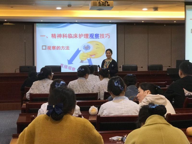 ????培訓(xùn)先是由張崇麗副主任護師講解“精神科觀察技巧與預(yù)見性思維”,張崇麗介紹了精神科臨床護理觀察方法、要求、內(nèi)容等,通過計劃性、整體性、技巧性、客觀性的對患者進行直接和間接的觀察,掌握患者精神癥狀、軀體情況、心理狀態(tài)等,對患者進行整體預(yù)見,對癥狀、體征進行預(yù)見性識別及推理,提前預(yù)知最可能出現(xiàn)的病情變化,或可能發(fā)生的各種常見風(fēng)險。從而在臨床護理實踐中,提高自身的臨床思維,增強護理問題的預(yù)見性,逐步建立起全面評估和護理患者的思維和行為模式。授課以提問、互動的方式進行,現(xiàn)場答疑解難,氣氛活躍,讓大家更好地掌握精神科臨床護理觀察技巧,靈活運用預(yù)見性思維。