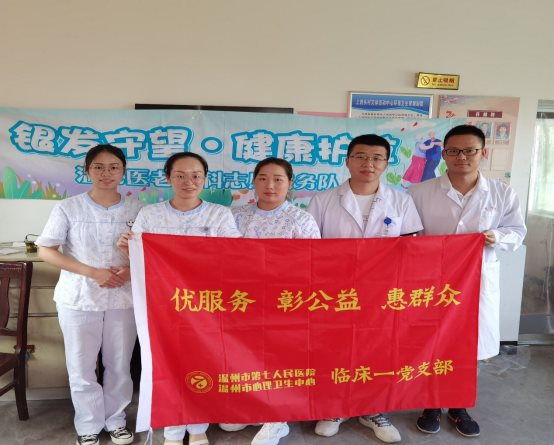 ? 08月18日,由我們老年科金愛(ài)敏護(hù)士長(zhǎng)帶領(lǐng)以“銀發(fā)守望-健康護(hù)航”為主題的志愿者服務(wù)隊(duì)與臨床第一支部志愿者來(lái)到洞頭嶺背社區(qū)與靈昆街道開(kāi)展了兩場(chǎng)義診活動(dòng)。