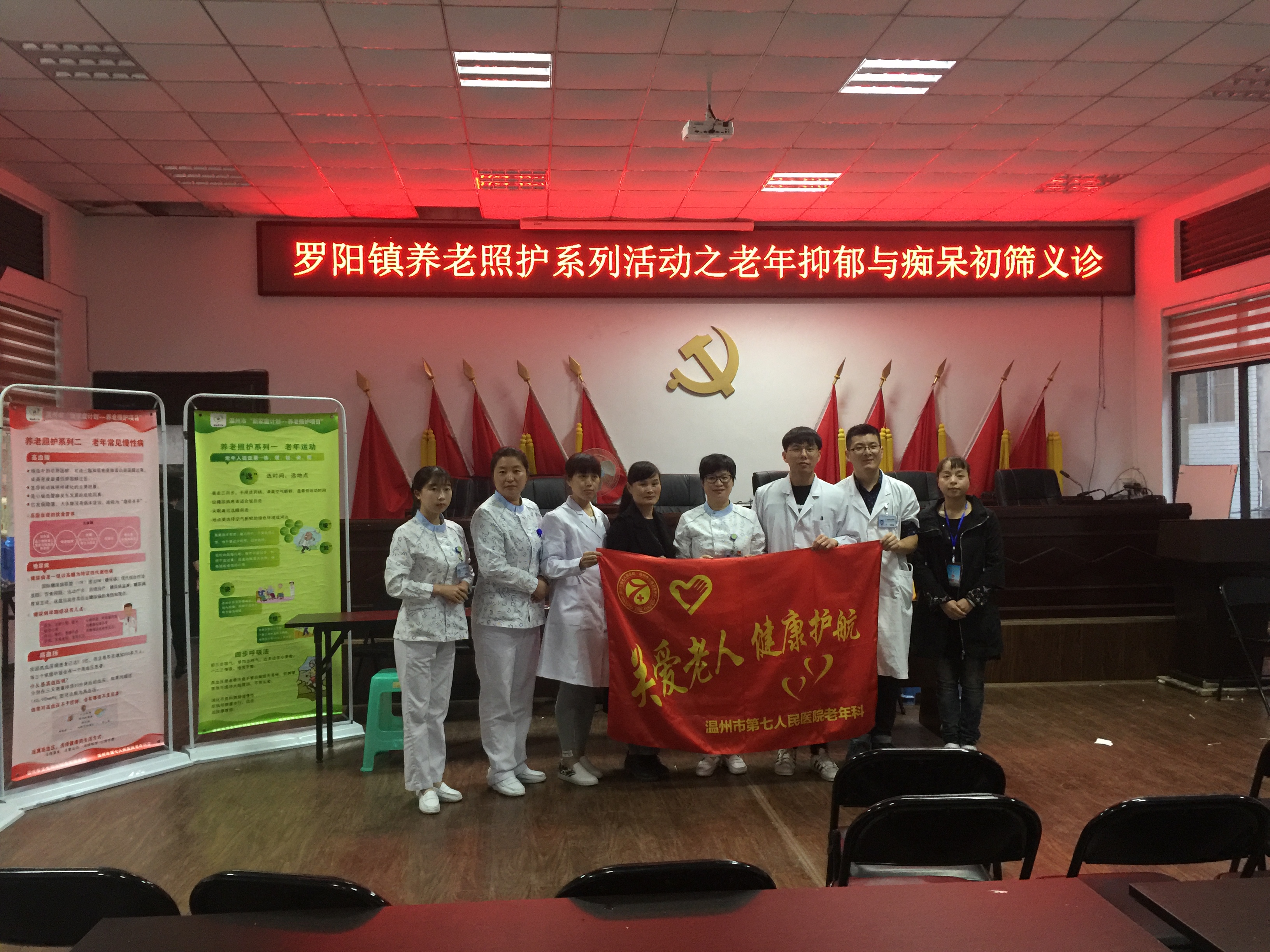 ?在十九大召開之際,1017日,老年科宋秀娟主任和陳建敏護(hù)士長(zhǎng)帶領(lǐng)醫(yī)療護(hù)衛(wèi)隊(duì)將溫暖送到泰順羅陽(yáng)鎮(zhèn)鎮(zhèn)府,為當(dāng)?shù)氐睦先碎_展老年抑郁和癡呆的篩查和義診活動(dòng)。