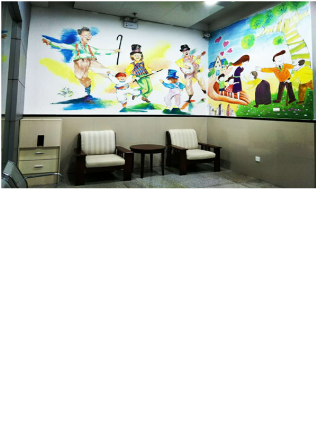 ??? 我們不僅為老年人提供最一流的醫(yī)療、最優(yōu)質(zhì)的護(hù)理服務(wù),更為這些失智老人、老年精神病患者提供最溫馨的家,使這些失智老人、生活不能自理的老人帶來最精彩的晚年生活,讓他們可以像圖片中的老年人一樣的唱歌、跳舞、彈琴。畫了三個跳舞老爺爺與兩個小孩的歌舞表演,表現(xiàn)出老人小孩在家庭里一樣重要,我們要像照顧孩子一樣照顧老人,這不僅是醫(yī)院的責(zé)任也是家庭的責(zé)任。背景墻適當(dāng)加上霓虹燈的效果,即簡潔,又符合醫(yī)院比較整潔的整體風(fēng)格。第一眼,給人歡快的感覺,吸引家屬的注意力。