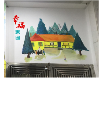 門上墻壁畫的是家,簡單的以房子代表家,突出家庭溫馨的主題。畫面上方撰寫文字:幸福家園。表示我們給老人提供溫馨的家,讓他們在這樣一樣安享晚年。另外也展示我們青年文明號這個大家庭的溫馨、朝氣蓬勃。