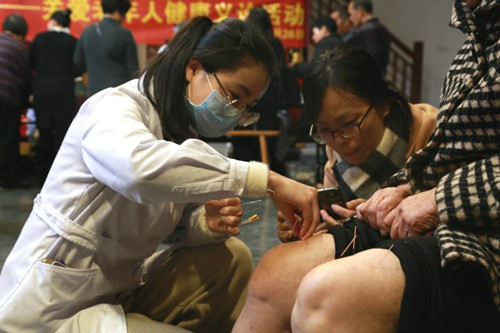 當市七醫(yī)義診隊來到文化禮堂時,熱情的村民早已排起長長的隊伍。義診現(xiàn)場,醫(yī)務(wù)人員緊張有序地發(fā)放健康宣傳資料,免費測血壓、血糖、骨密度,進行中醫(yī)針灸、艾灸,內(nèi)科咨詢……醫(yī)務(wù)人員為每位前來咨詢的群眾詳細問診、認真查體、詢問病史、了解病情,并給予合理的治療建議。“哇,真的太厲害了,真的不流眼淚了!”某位村民發(fā)出感慨。原來是這是一位受面癱困擾的村民,由于面癱其中有一只眼睛會不受控制的流眼淚,在接受完中醫(yī)針灸后,眼淚立馬就止住了,治療效果立竿見影!據(jù)悉,本次受益群眾達400余人。