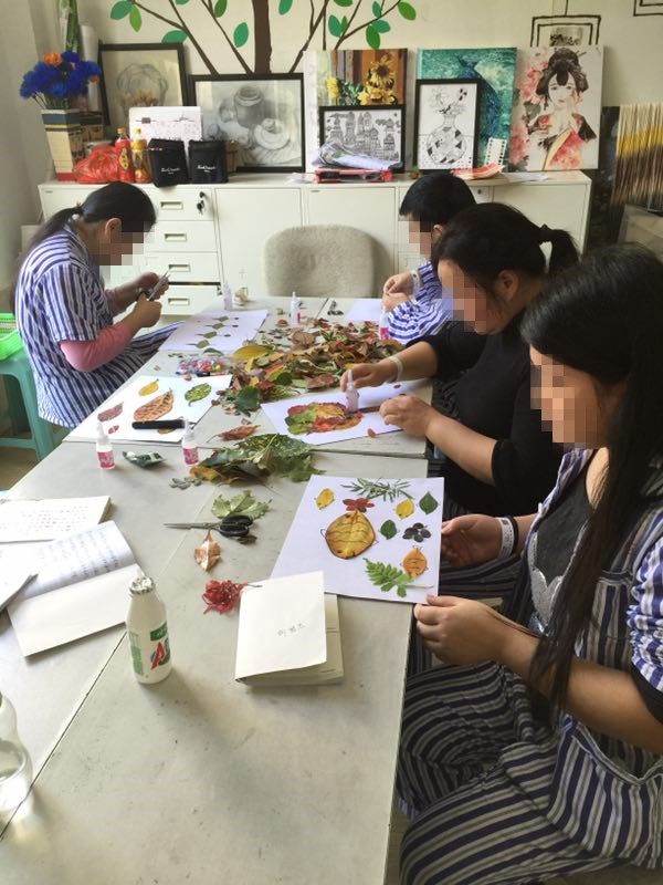? ? ? ??經(jīng)過幾天的收集,康復(fù)員們收獲頗豐。在一桌子落葉中精挑細(xì)選后,便迫不及待地開始了他們的創(chuàng)作……畫紙,彩筆,紐扣,蕾絲帶,白膠配合著落葉輪番上陣,一個(gè)小時(shí)后,作品們的真面目漸漸浮出水面……