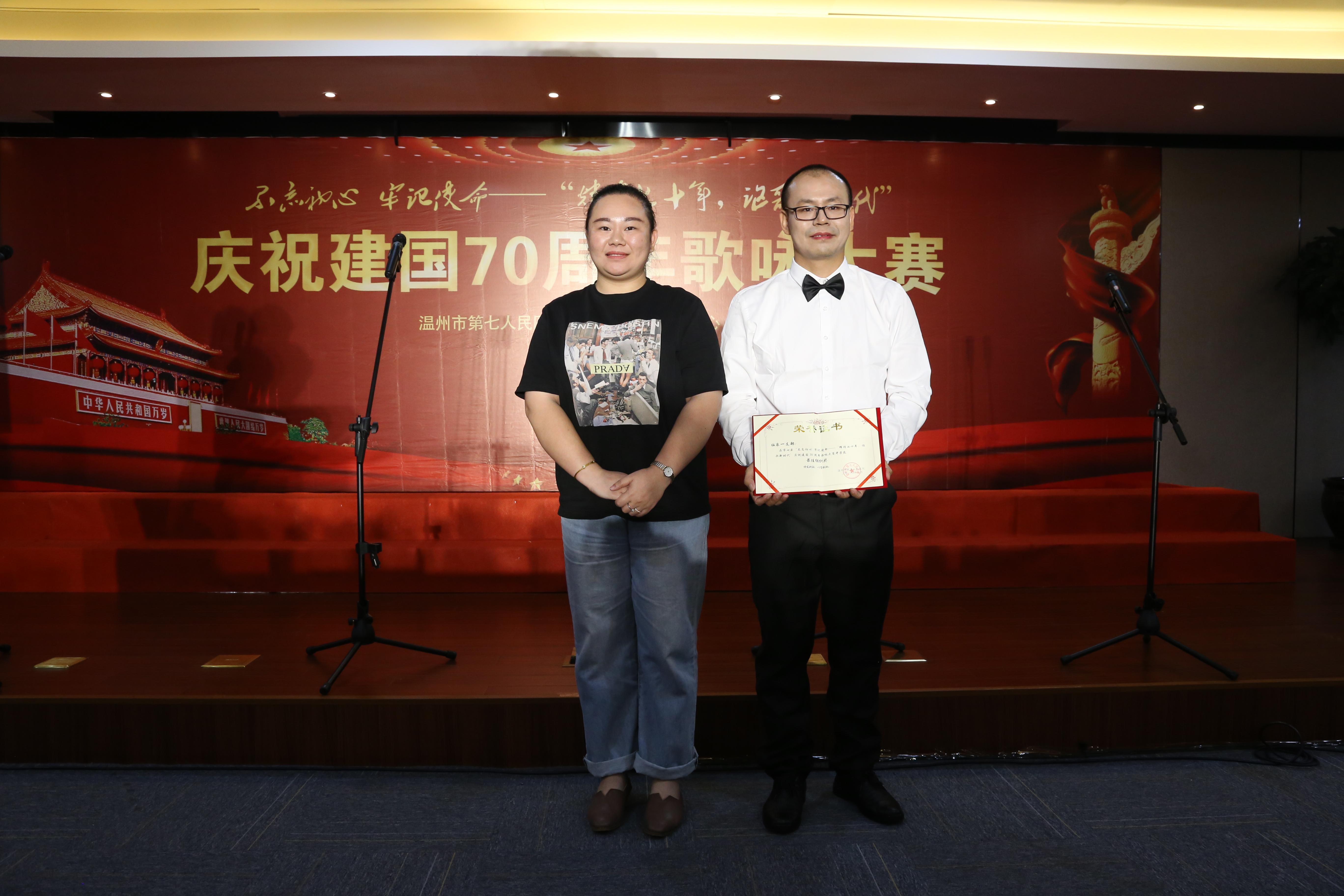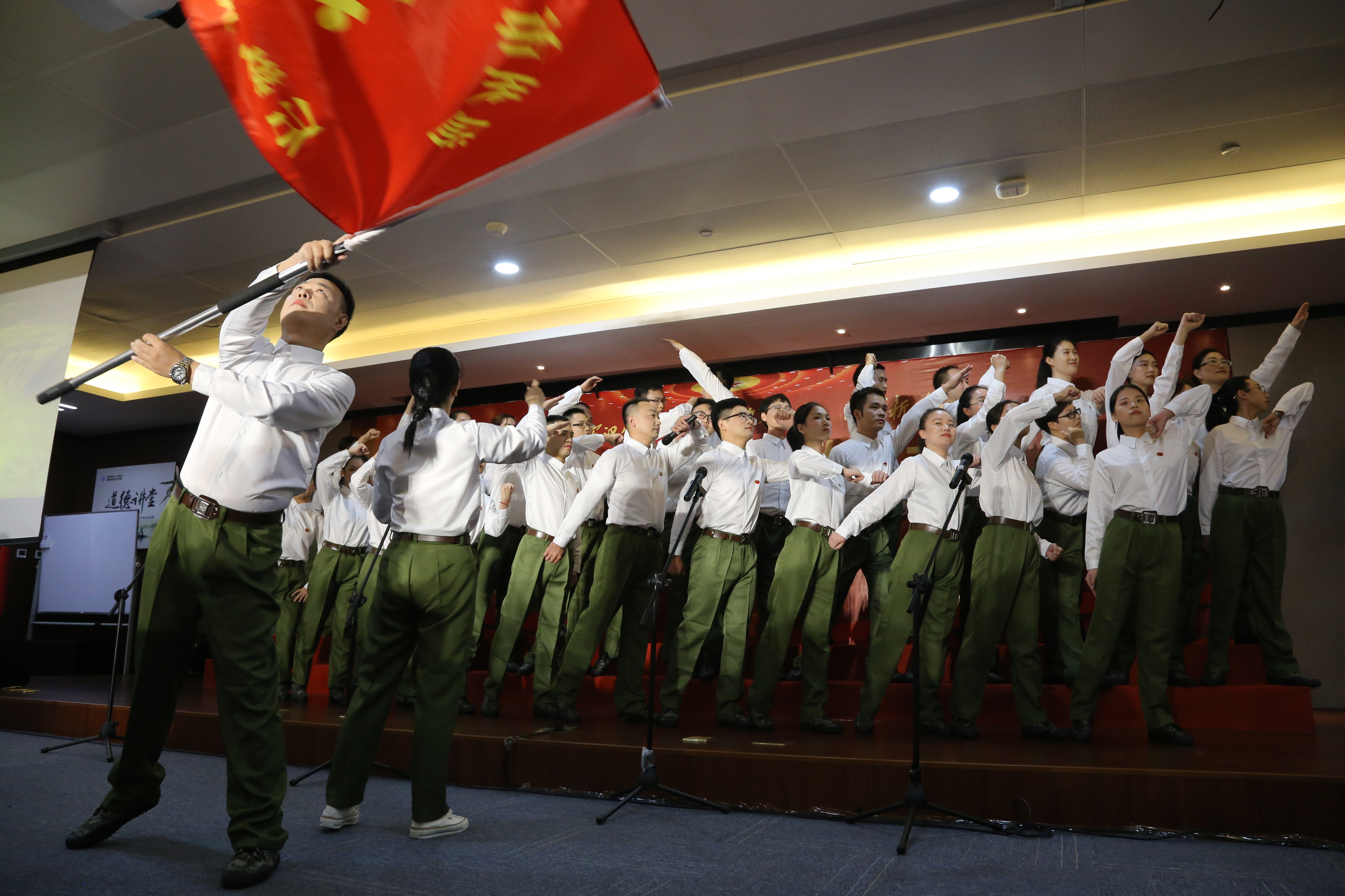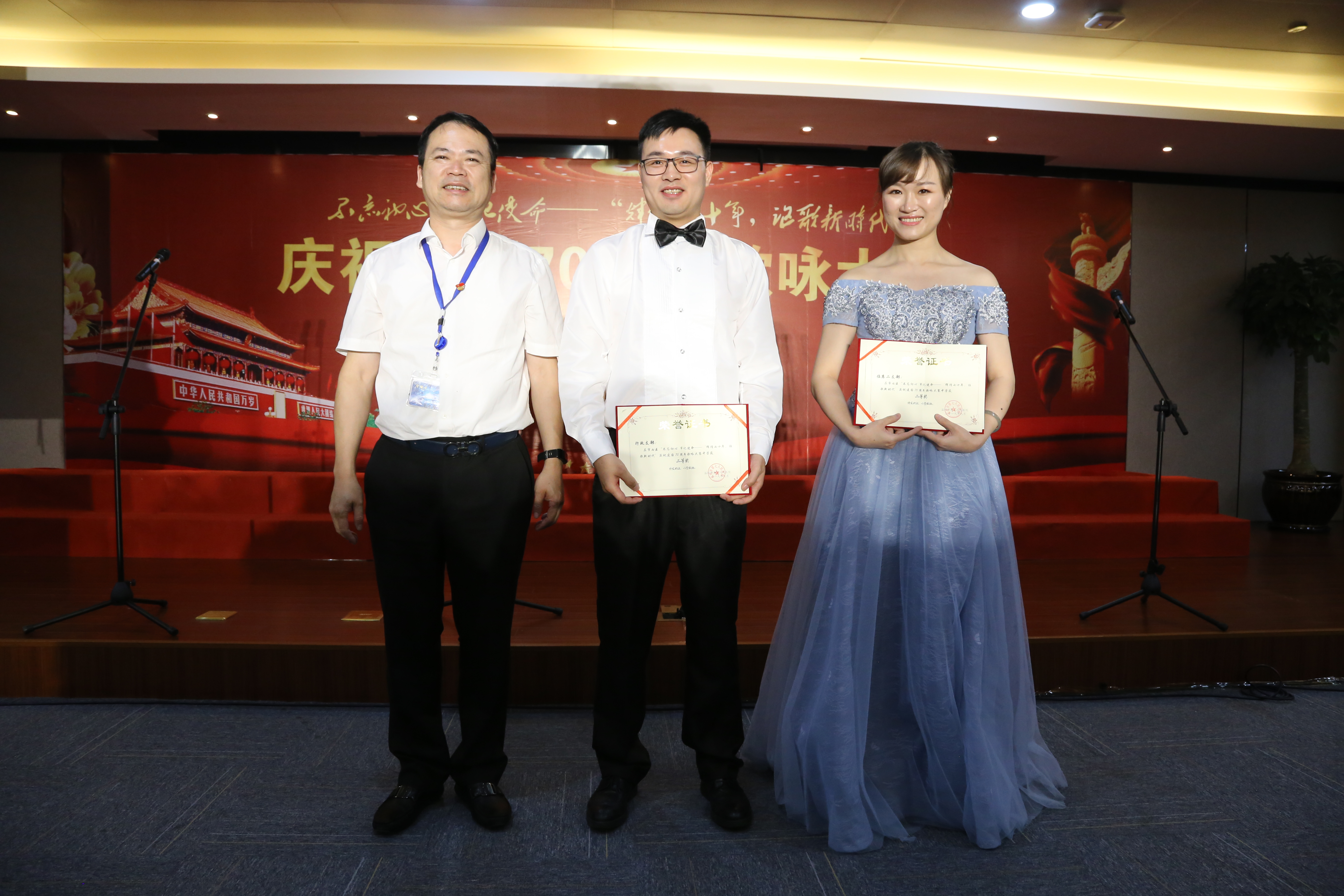 歌詠誦讀會在陳靖、方春霞、曹文虎、林飛飛的領(lǐng)唱下,在全場肅立、全體人員揮舞著五星紅旗,高唱《我和我的祖國》的歌聲中完美落幕。