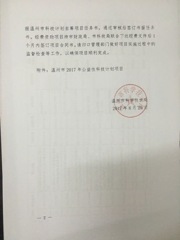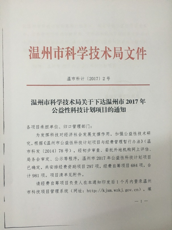 溫州市科學(xué)技術(shù)局關(guān)于下達(dá)溫州市2017年公益性科技計(jì)劃項(xiàng)目的通知