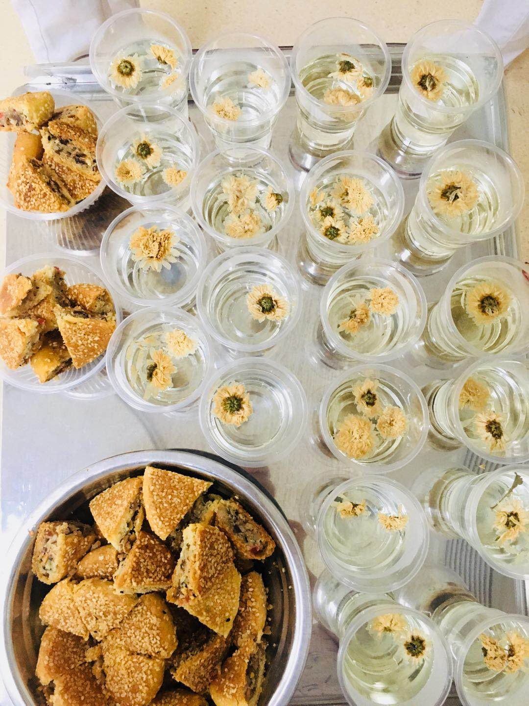 ??活動仍在繼續(xù),接下來有擊鼓傳花的游戲,傳到誰就表演一個節(jié)目。他們認(rèn)真的玩著游戲,用心的表演。我們?yōu)樗麄儨?zhǔn)備了菊花茶和月餅,大家一起分享著這個美好的時光。