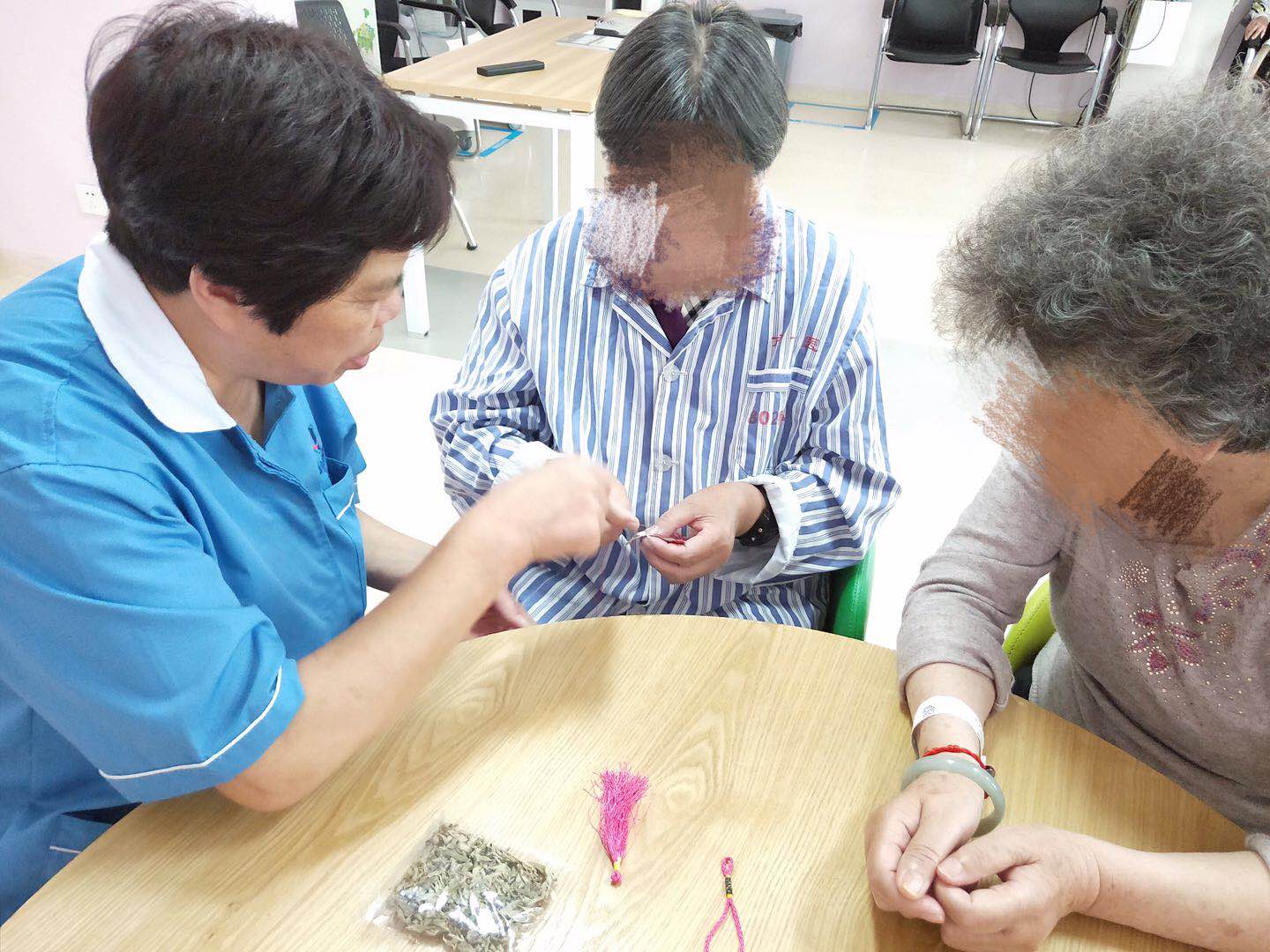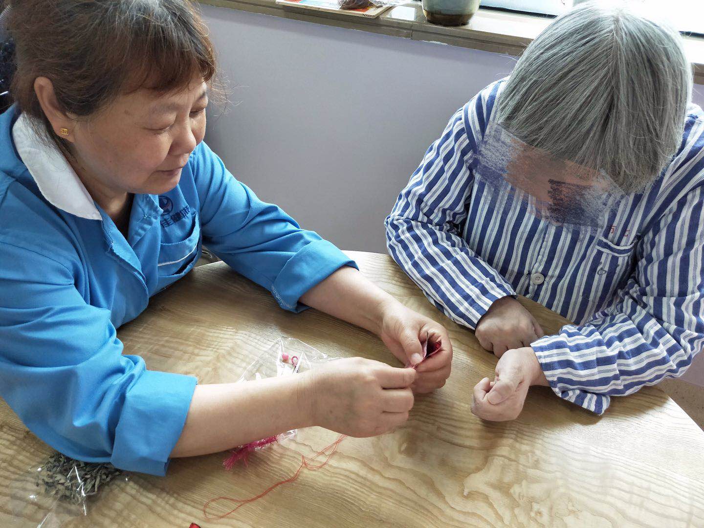 ?于是,說干就干。在護(hù)士的帶領(lǐng)下,患者在陪護(hù)的協(xié)助下共同參與制作香囊。護(hù)士將已曬好的艾葉、布料、針線準(zhǔn)備到位?;颊邆兣d致勃勃,動起手來。別看他們頭發(fā)花白,有的患者的針線活可不見得比我們差。他們能熟練的縫著香囊,做出來的成品也是很不錯的。有的患者眼睛不便,也能在陪護(hù)阿姨的幫助下共同完成。
