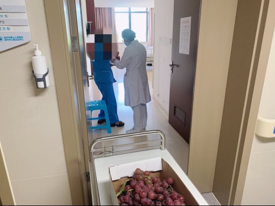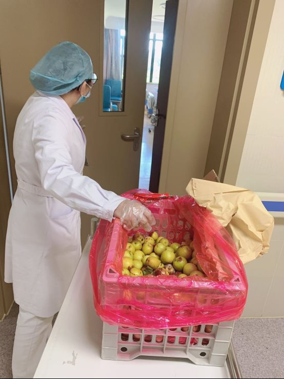 ? 幾經(jīng)勸說(shuō),家屬還是不愿離去,最后報(bào)告給監(jiān)察室以及征得家屬的同意,我們準(zhǔn)備把這些水果,分發(fā)給我們病區(qū)所有的病人,讓大家一起分享這份溫暖(因?yàn)楦綦x,里面的病人及陪護(hù)都不能正常進(jìn)出,購(gòu)買生活用品)。看到他們拿到水果時(shí),那簡(jiǎn)單純粹的笑容,感染了我們每一位醫(yī)務(wù)人員。