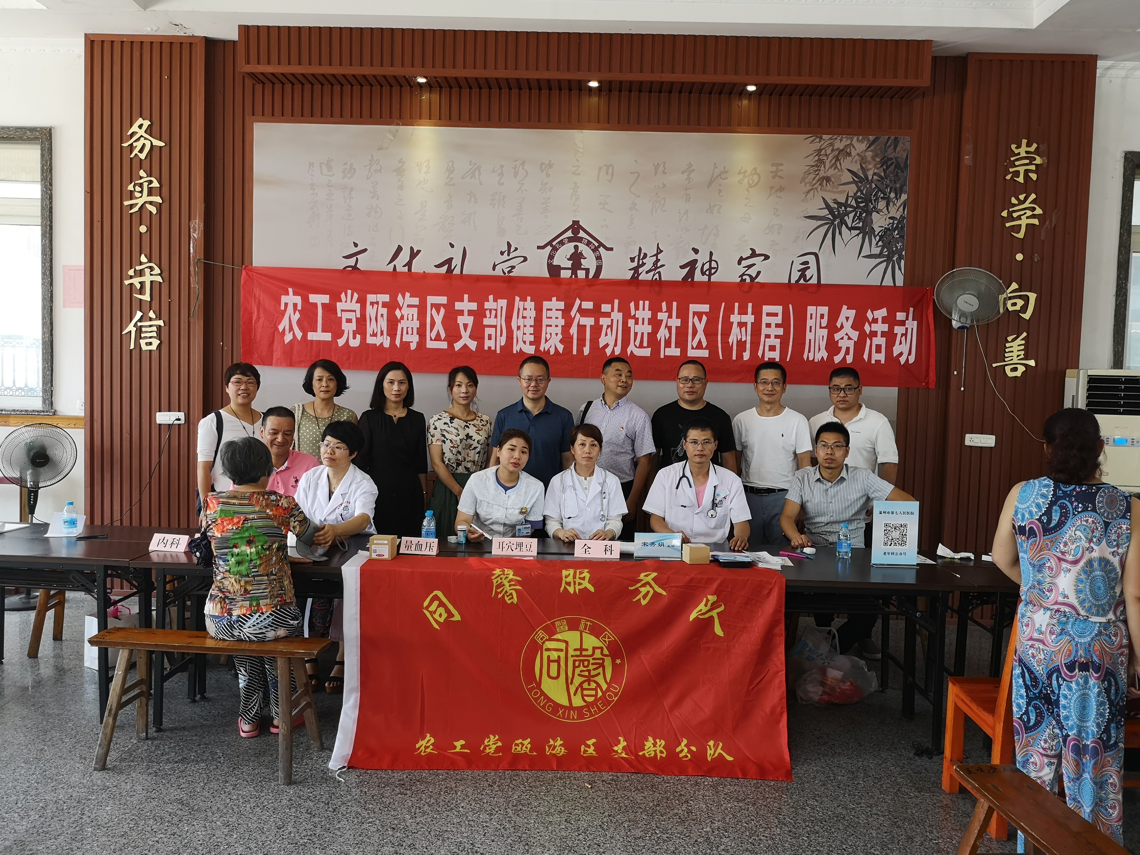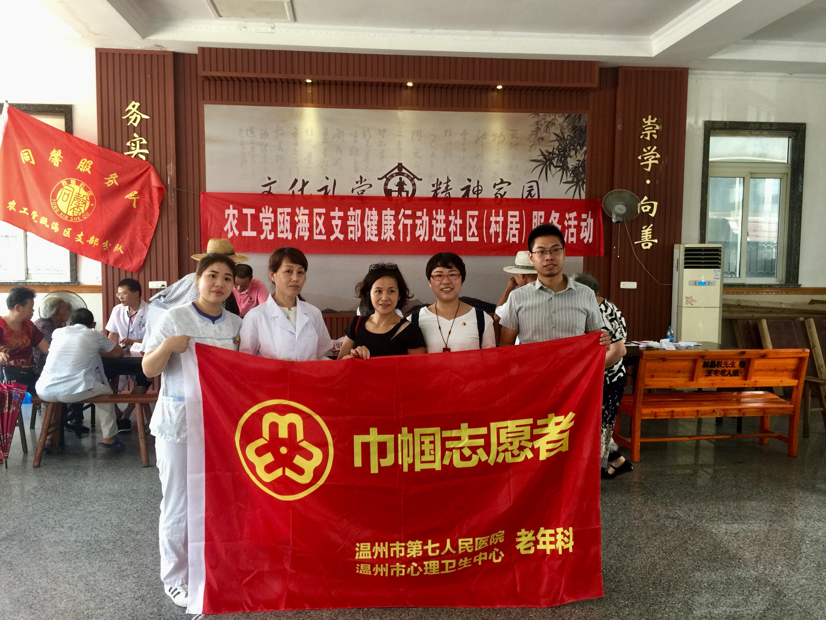 ? ? ? ?為關(guān)愛社區(qū)中老年人的身體健康,增強(qiáng)社區(qū)居民的疾病防范意識,甌海區(qū)委統(tǒng)戰(zhàn)部組織甌海支部農(nóng)工黨員于629日上午赴麗岙街道王宅村開展同馨社區(qū)活動,開展專場義診活動,服務(wù)對象均是留守的僑眷老人;服務(wù)項(xiàng)目:送醫(yī)送藥。巾幗志愿者溫七醫(yī)老年科宋秀娟主任一行三人代表七醫(yī)參加了此次活動。?
