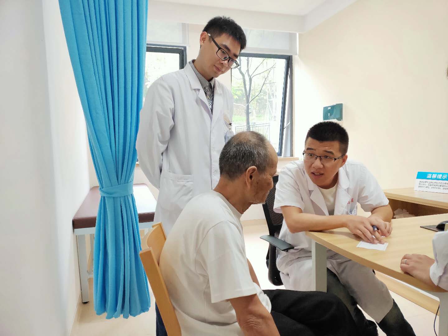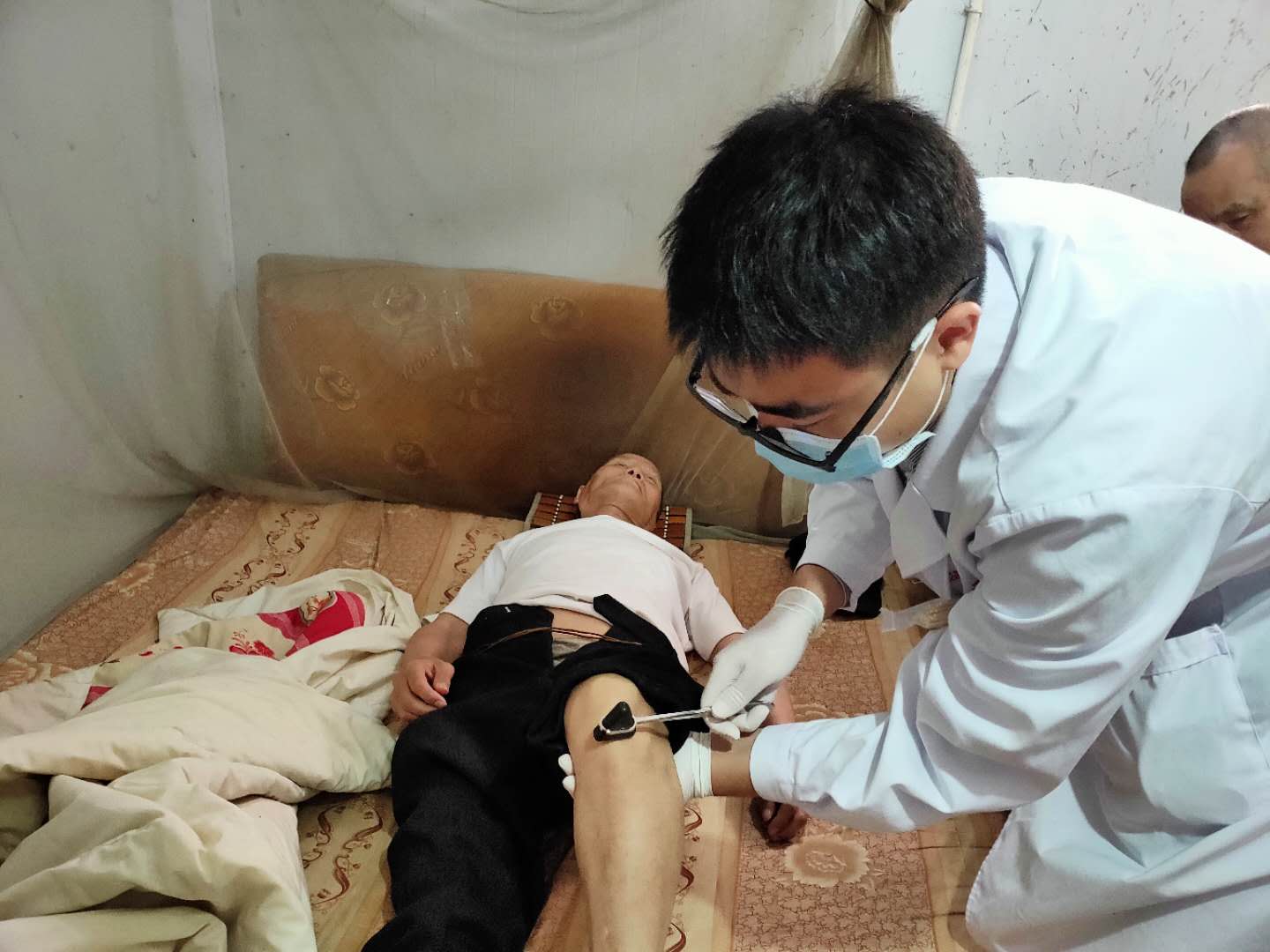 ???當(dāng)日上午,一行人到達該老人家中,十多平方無窗的老舊臥室內(nèi),老人衣冠整潔,安靜躺在床上,一言不發(fā),囔囔自語,家人已為老人取下左腳鐵鏈。我院張秀澄醫(yī)生、石學(xué)敏醫(yī)生屈身半蹲做好解釋:“阿公,我們給您來檢查下身體,可以嗎?”阿公點點頭。詢問其本人具體情況時,老人不語。兩位醫(yī)生繼續(xù)給予初步的神經(jīng)系統(tǒng)、心臟、胸肺、腹部體格檢查、日常生活能力評估等,在陳艷護士長的溝通、牽引下,老人自行下地行走,回到前廳,與家人促膝而坐。